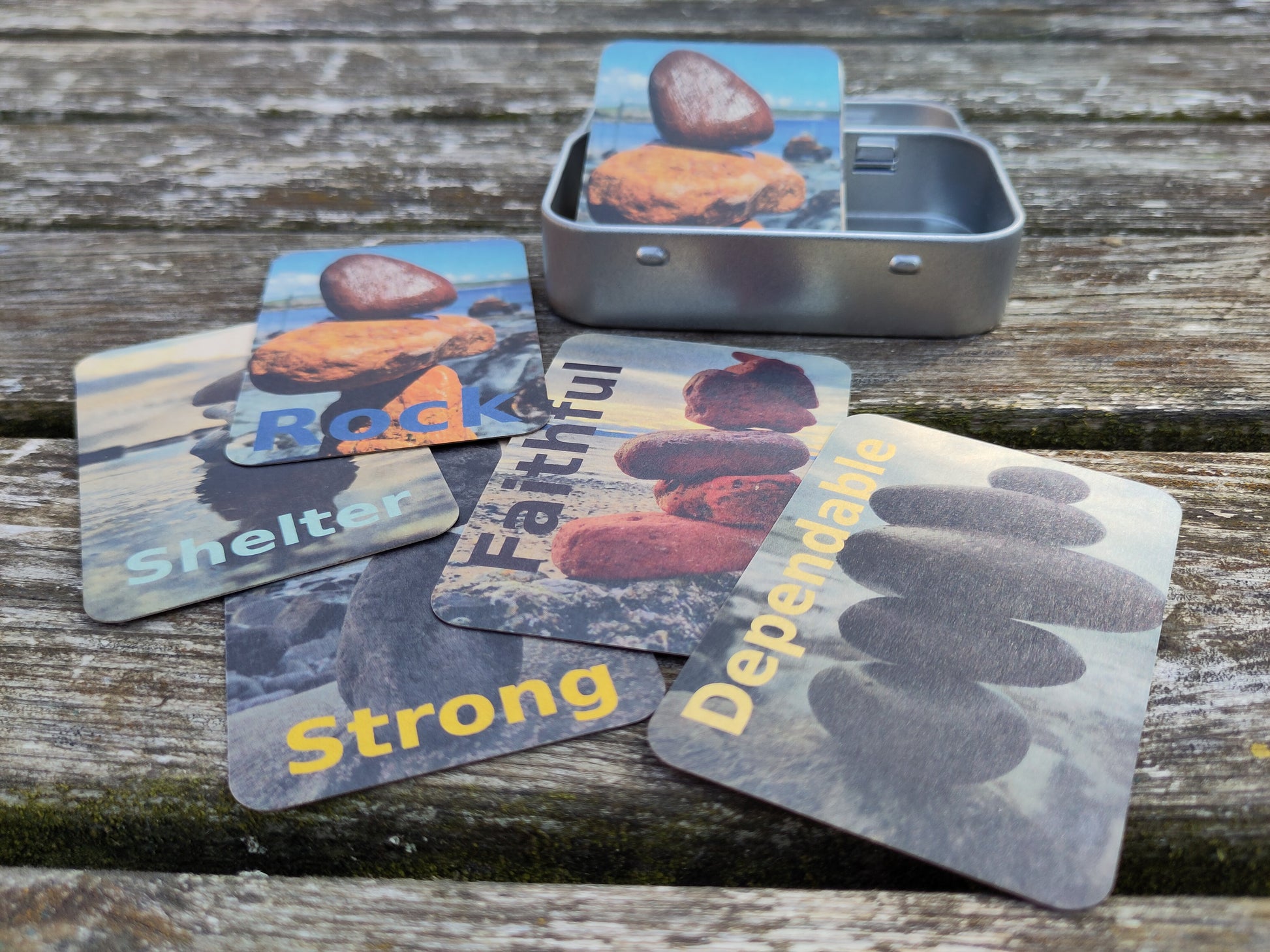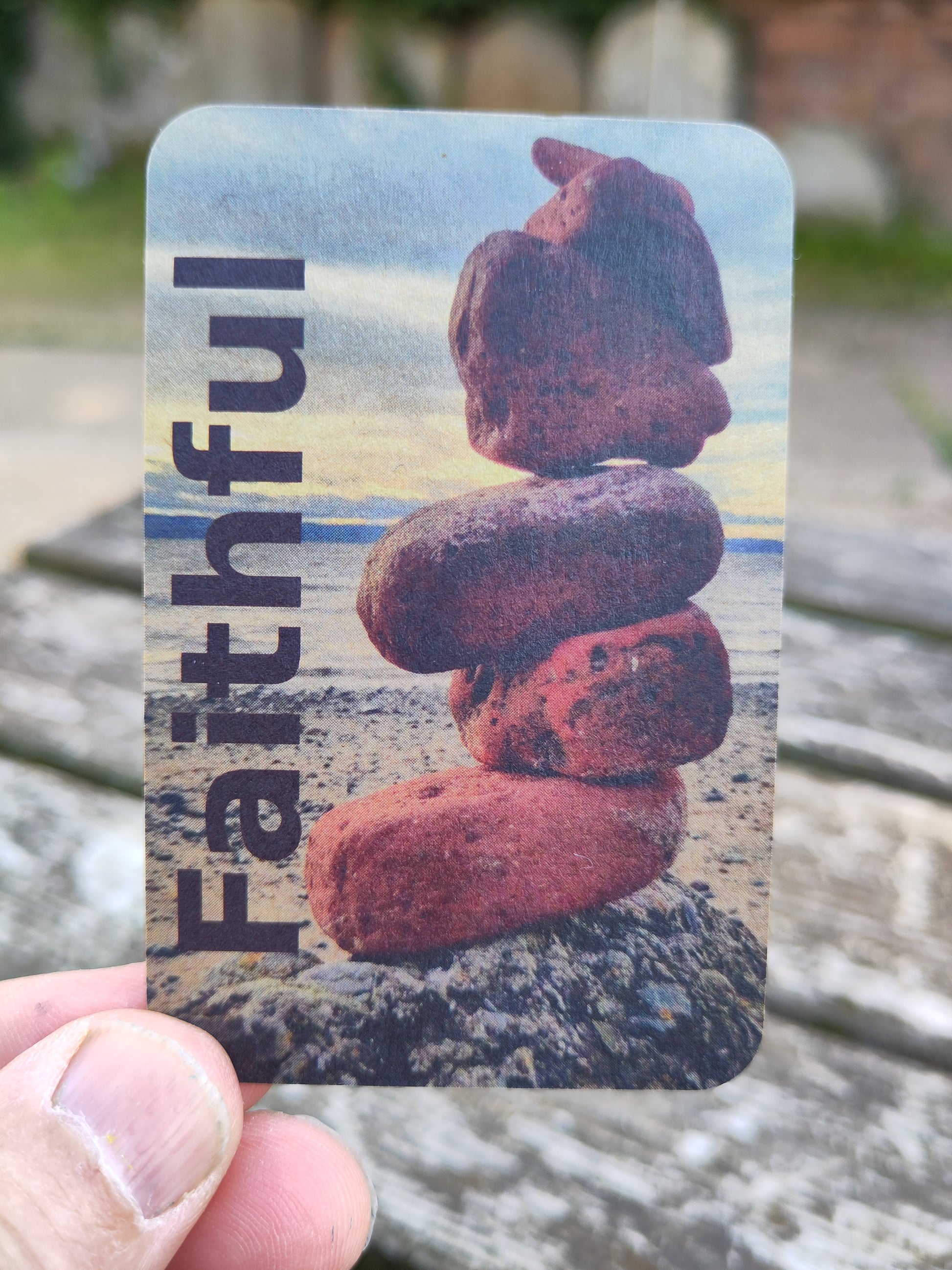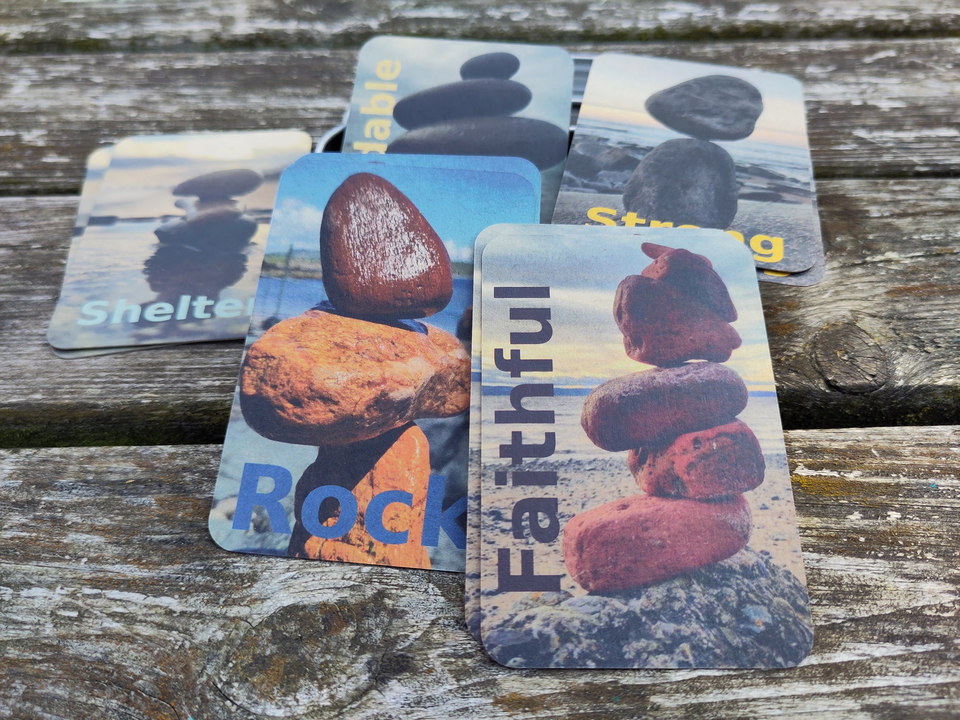 So, what are on the cards? There are 5 different pictures of sculptures, showing 'Land Art' that I have created with encouragements to keep looking to God the Rock.