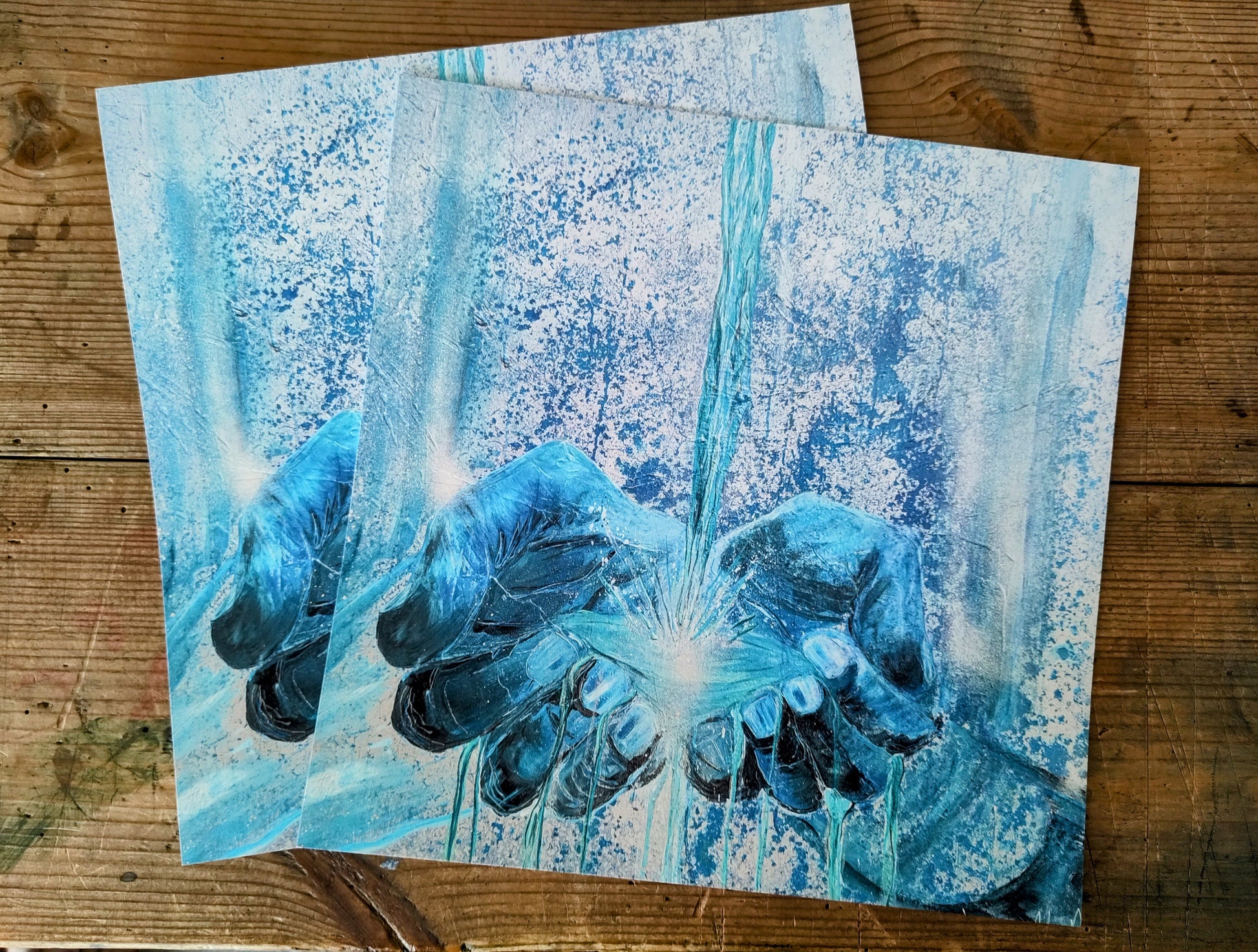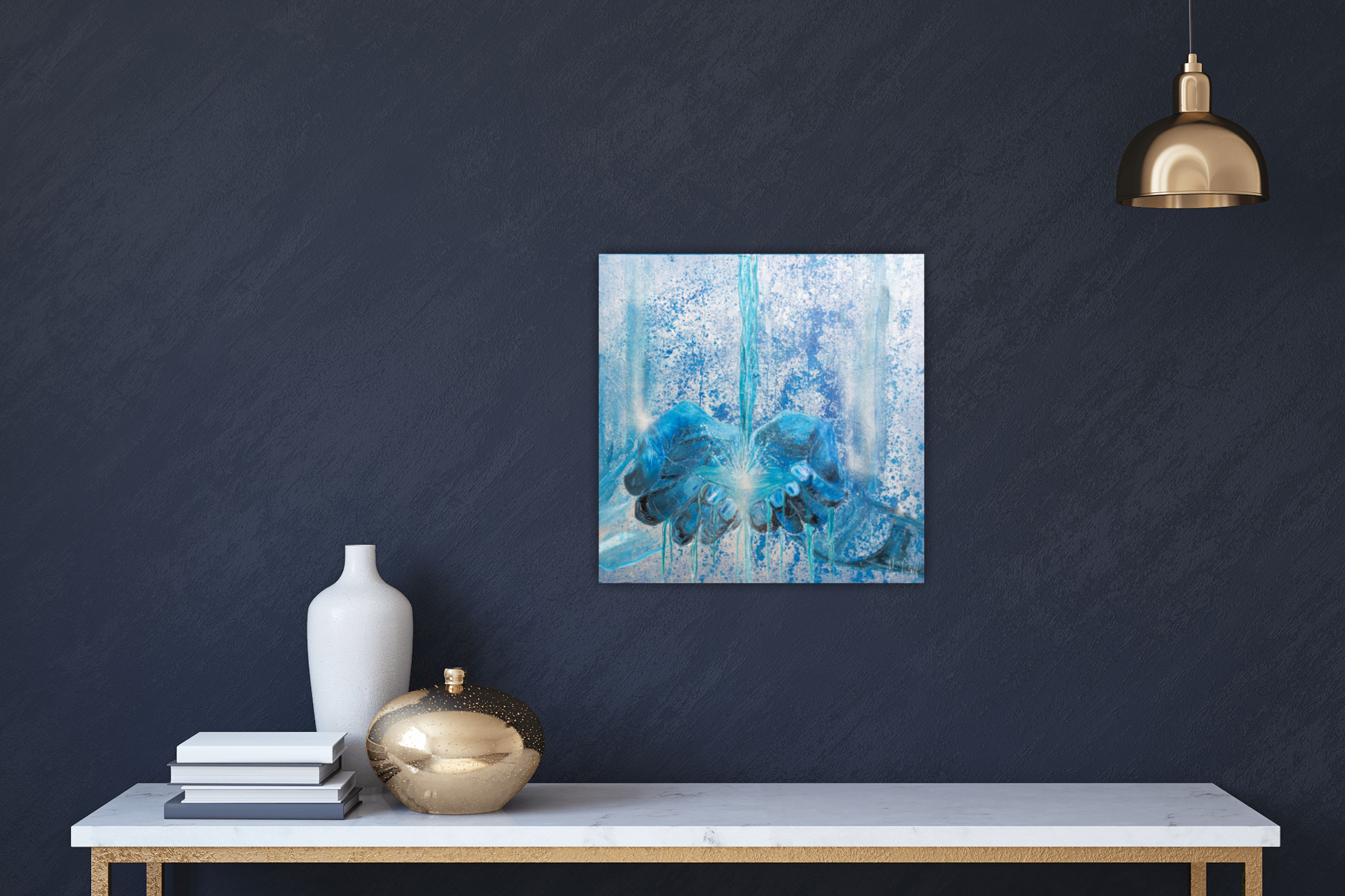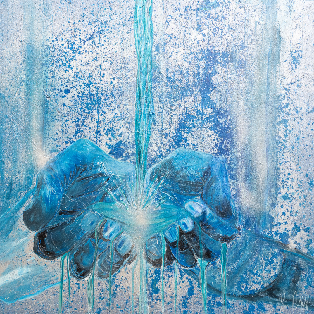 This is symbolised in the painting using colours of living water as well as silvers to represent the heavenly realm. The living water is gushing over and through the hands to represent that the favour of God is not for keeping but sharing out for the benefit of all.