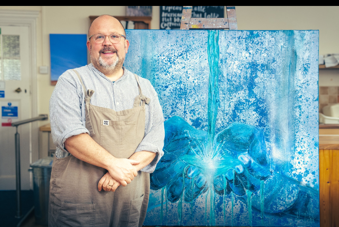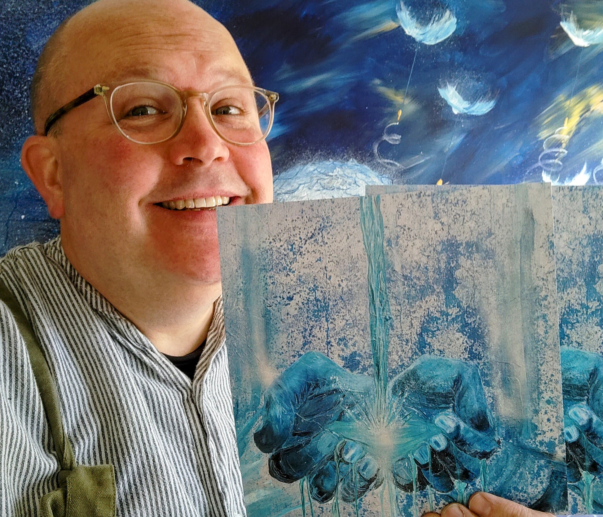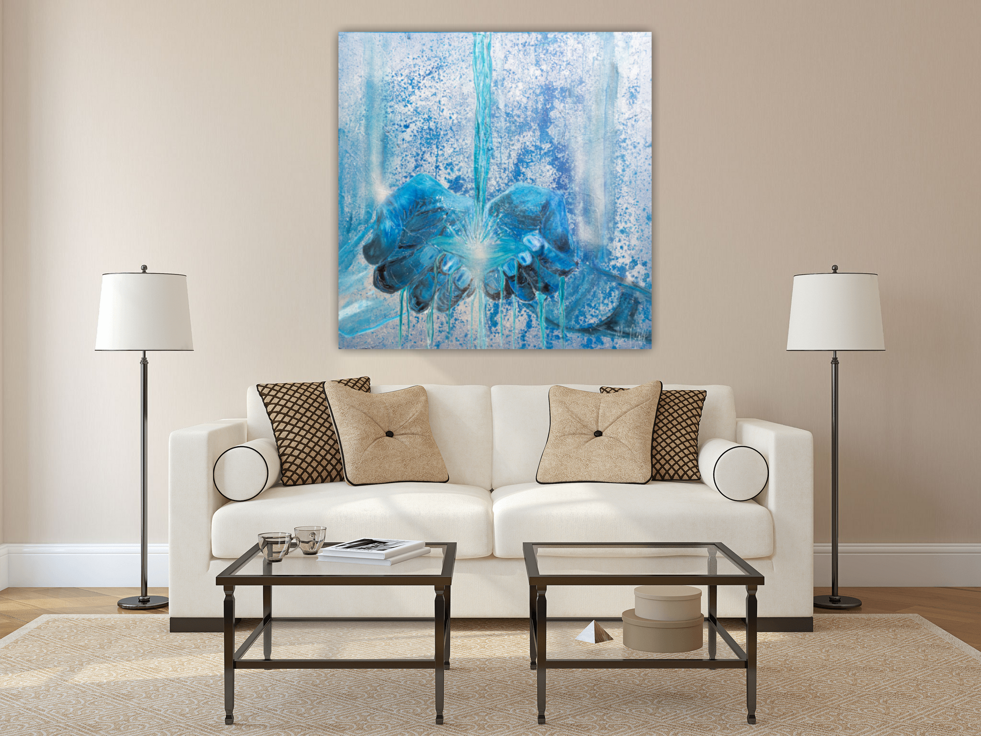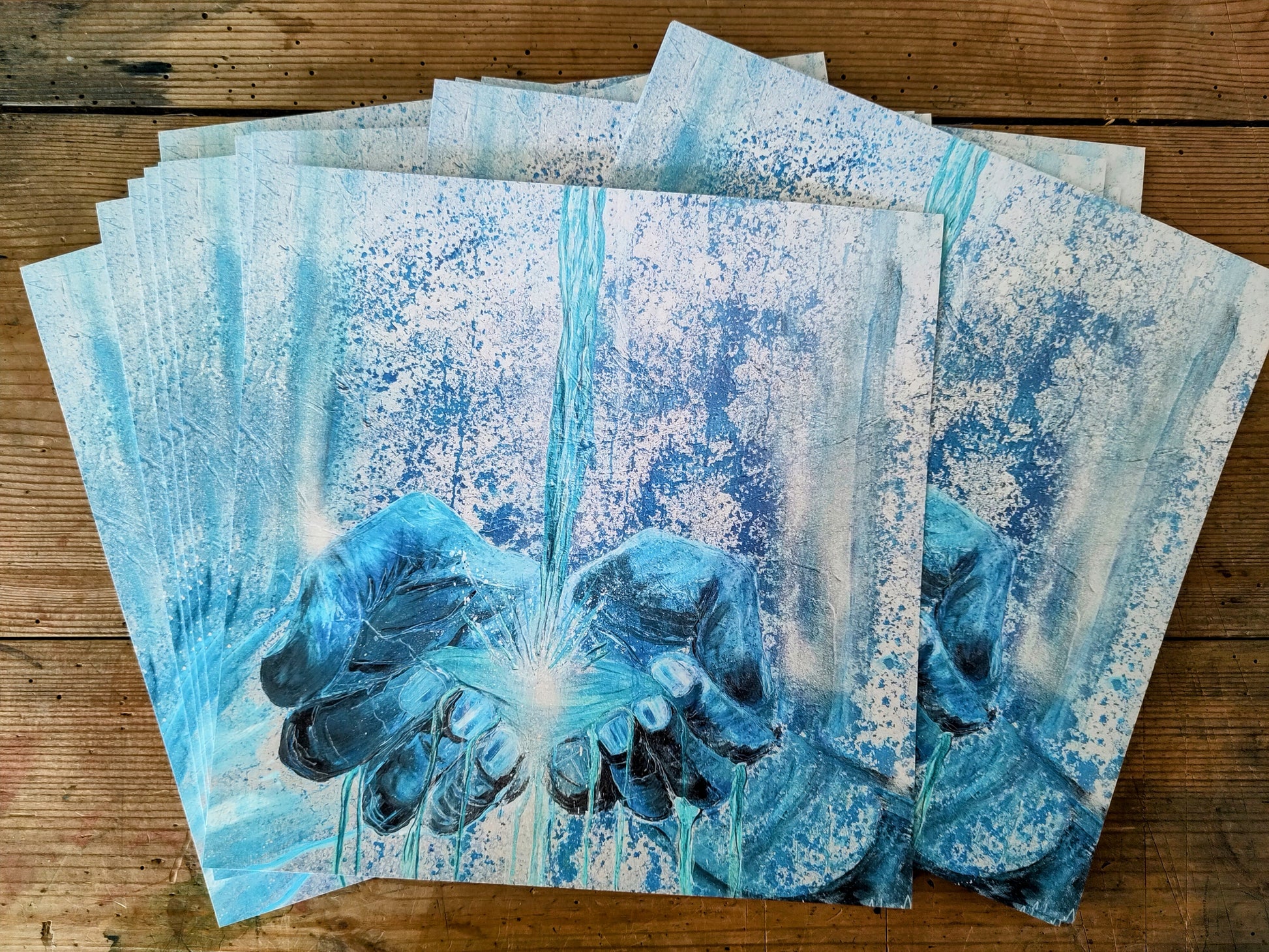 This is symbolised in the painting using colours of living water as well as silvers to represent the heavenly realm. The living water is gushing over and through the hands to represent that the favour of God is not for keeping but sharing out for the benefit of all.