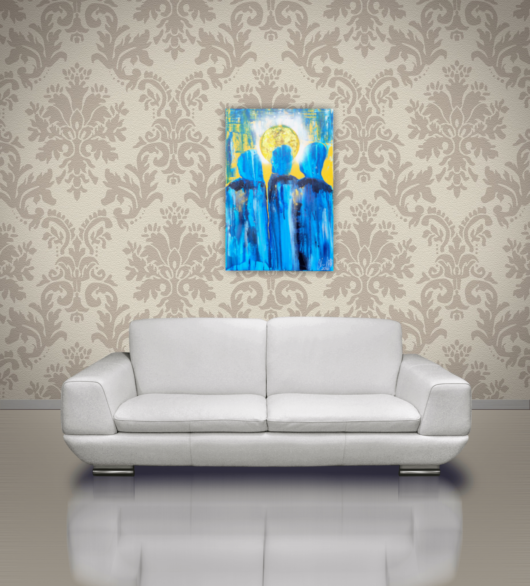 I wanted to capture the walking and talking on the road with hearts burning. Jesus is in the middle, shown by the gold halo around Him, but the couple one either side also have gold, but it's where their hearts are. Burning within them!