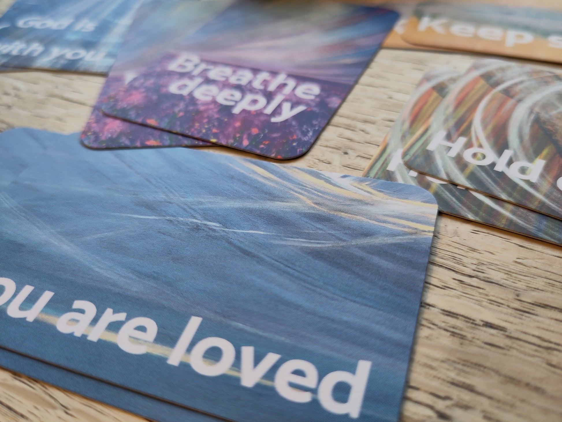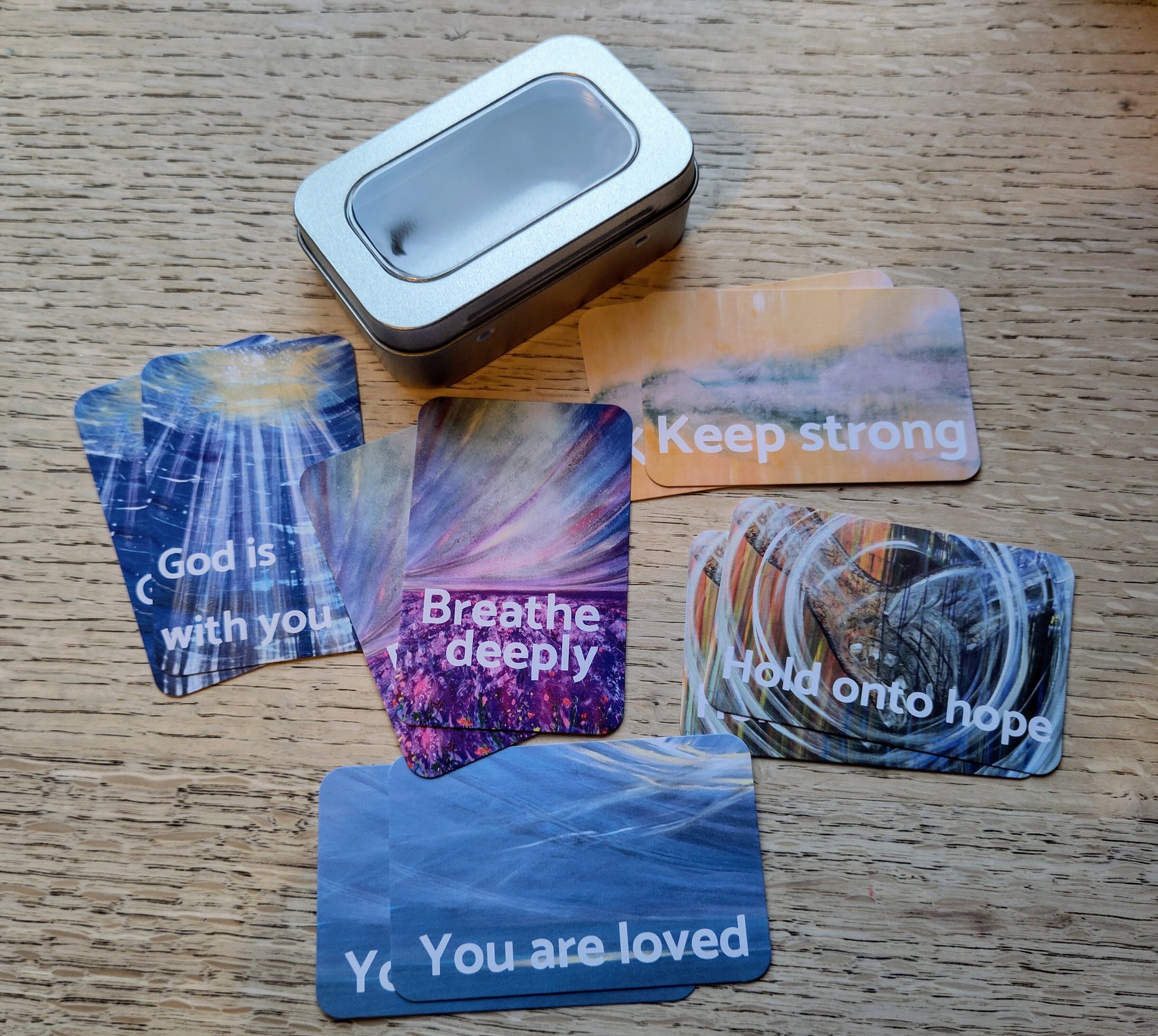 Encourage friends to keep going in tough times. 5 designs, small cards of blessing with a verse from the bible on each. Perfect to carry and leave in places for people to find.